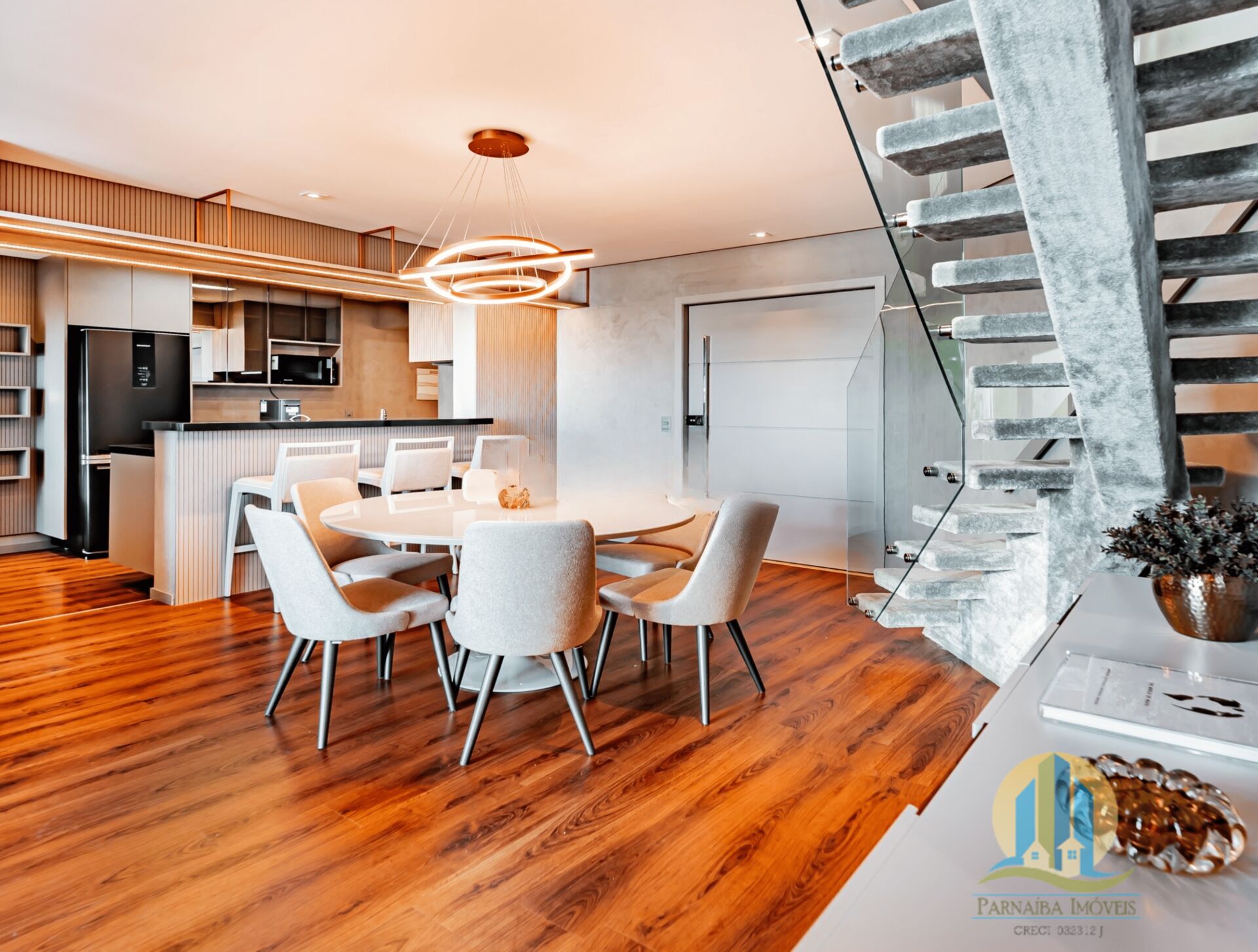 - Living com Pé Direito Duplo: Integrado à cozinha e à sala de jantar, proporcionando um ambiente amplo e arejado.