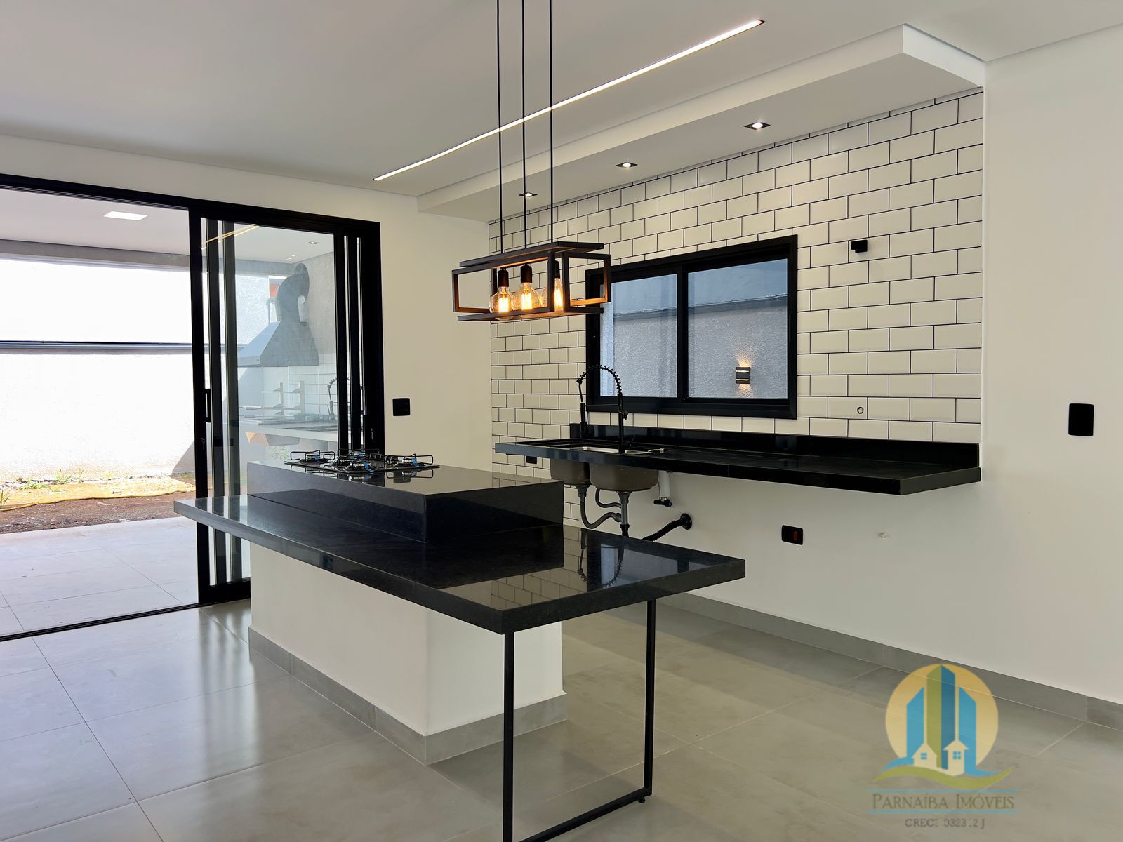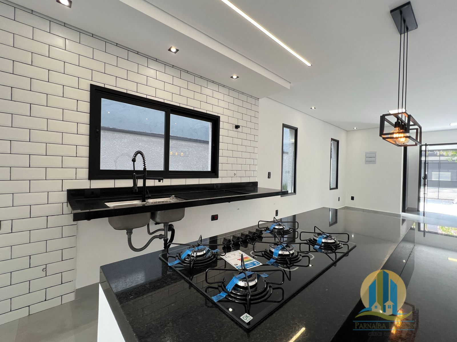 🔹 Sala e cozinha integradas em conceito aberto, com ilha central e cooktop