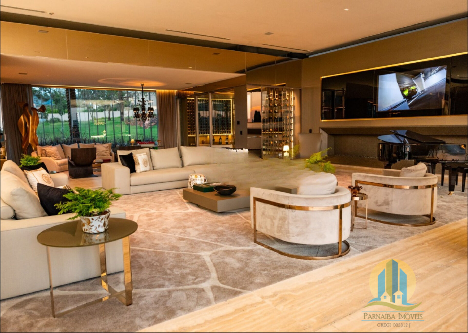 - Living: Lareira a gás revestida em Armani Gris, piano Yamaha, e uma adega climatizada com capacidade para mais de 1.000 garrafas.